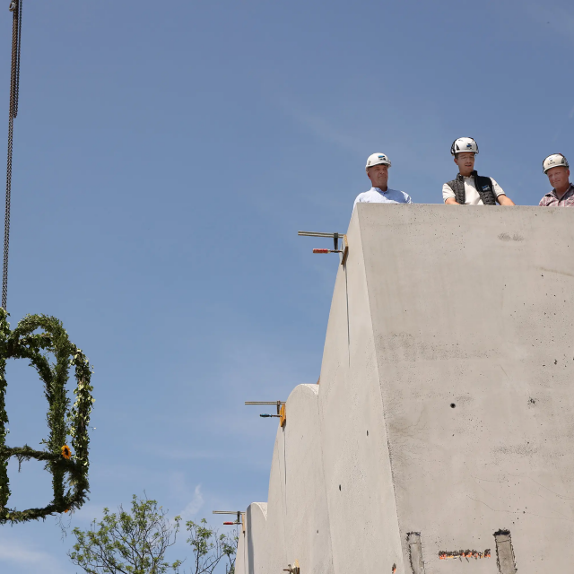 Knapp 70 Jahre nachdem Carl Orff selbst im Ziegelstadel 1 den Ausbau seines Hauses feierte, fand nun erneut ein Richtfest statt. Schülerinnen und Schüler der Dießener Carl-Orff-Schule eröffneten das Fest mit Liedern. Danach begrüßte Generalsekretärin Judith Janowski die Anwesenden und dankte insbesondere allen Fördergebern, die das Museum großzügig unterstützen. Zu guter Letzt hielten Bauleiter Torsten Huhle von der ausführenden Firma Lutzenberger, Polier Christoph Meyer und Beton-Experte Lukas Schröther den Richtspruch und leerten unter dem Beifall der Gäste dreimal ihre Gläser: „Möge das Museum ein Ort der Erkenntnis, des Staunens und der Inspiration sein, wo Geschichte lebendig wird, und Wissen blüht.“