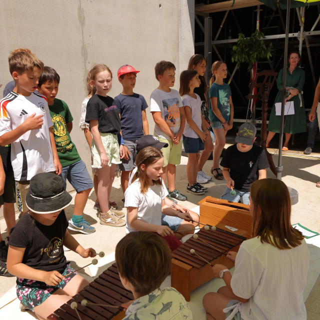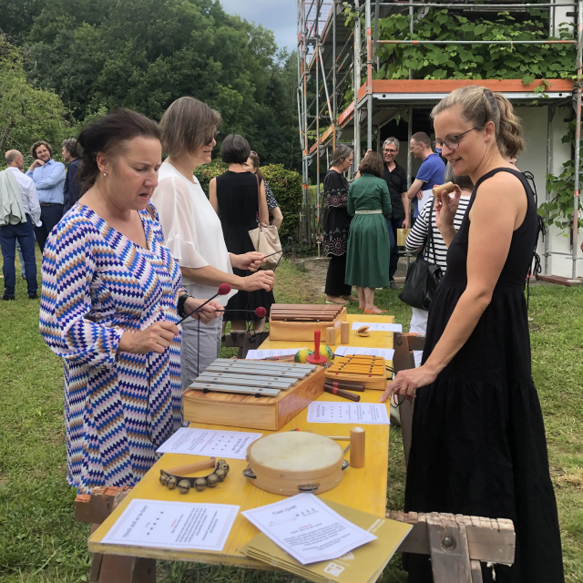 Im Anschluss an den Festakt wurde im Innenhof des Orff-Anwesens gefeiert. Bei Speis und Trank konnten sich die Gäste stärken. An einem improvisierten Tisch mit Instrumenten und Spielkarten gab es die Möglichkeit erstmals eine Mitmachstation des zukünftigen Museums zu testen und Carl Orff ein Geburtstagsständchen zu bringen.
